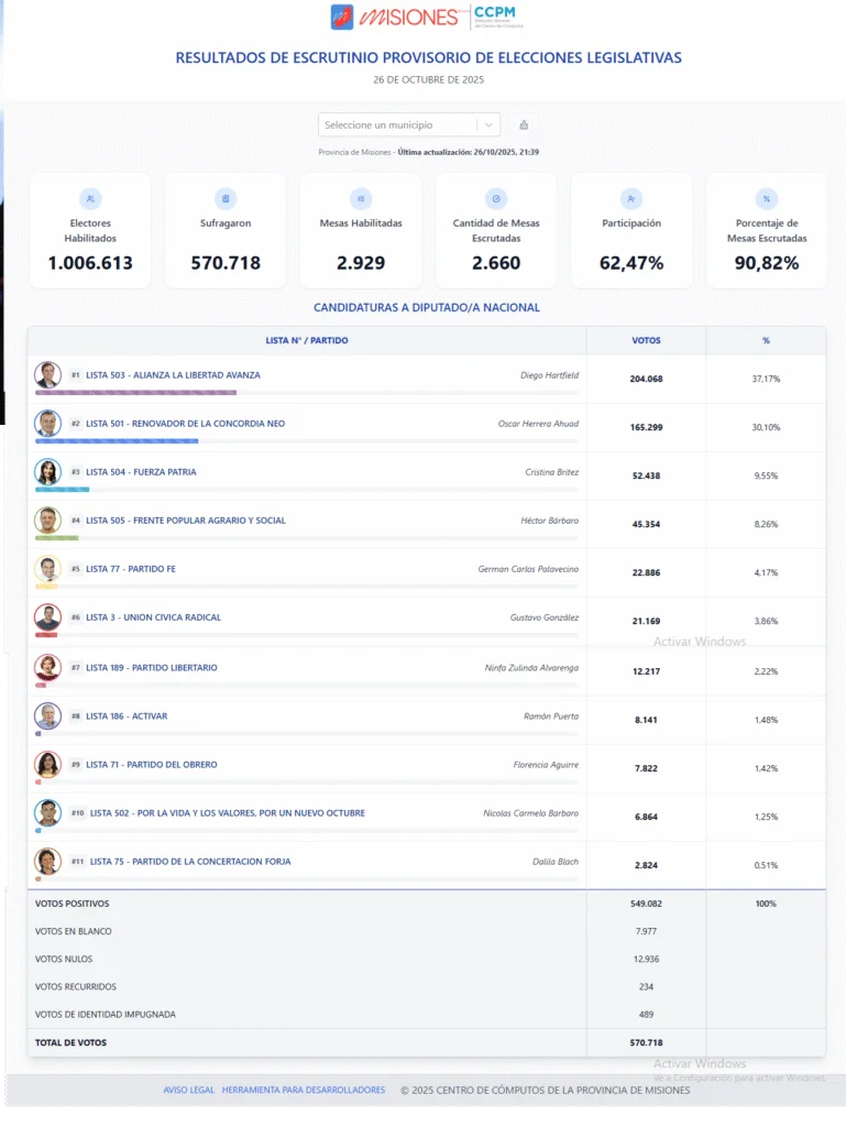 Los resultados provisionales ratifican el ascenso de La Libertad Avanza en Misiones, que consolida su presencia en el electorado provincial, mientras que el Frente Renovador mantiene su peso político y territorial, posicionando a Herrera Ahuad como referente del espacio en el Congreso nacional.